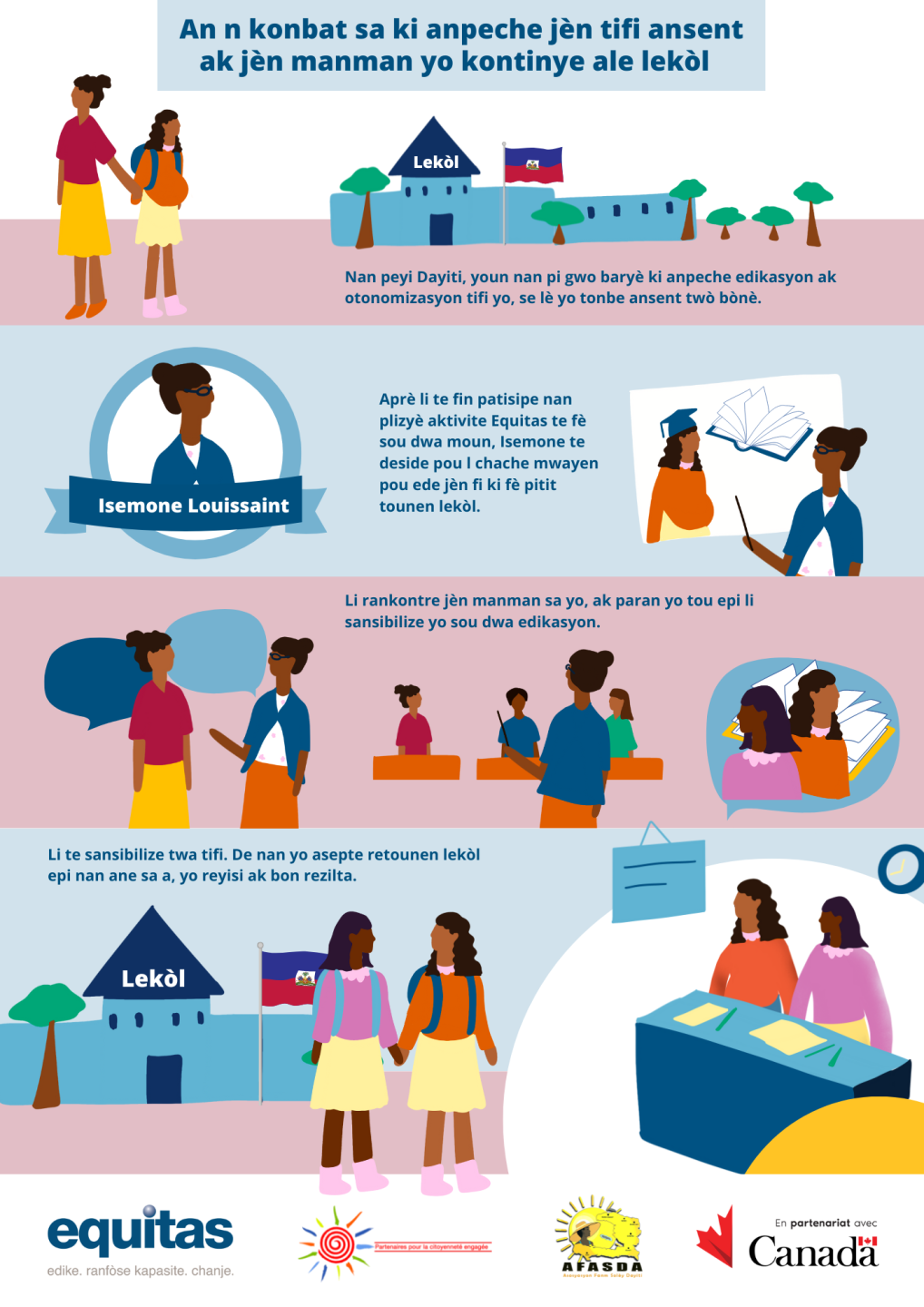 This last issue particularly affected Isemone Louissaint, Director of the National School of Thomassique, who participated in one of the forums. Having witnessed this problem herself in her school, she understands that if young girls do not have access to education, it directly affects their empowerment and thus their future participation in decision-making spaces. Firmly believing that all girls have the right to education, whether they are mothers or not, she decided to mobilize to promote the return of young mothers to her school.