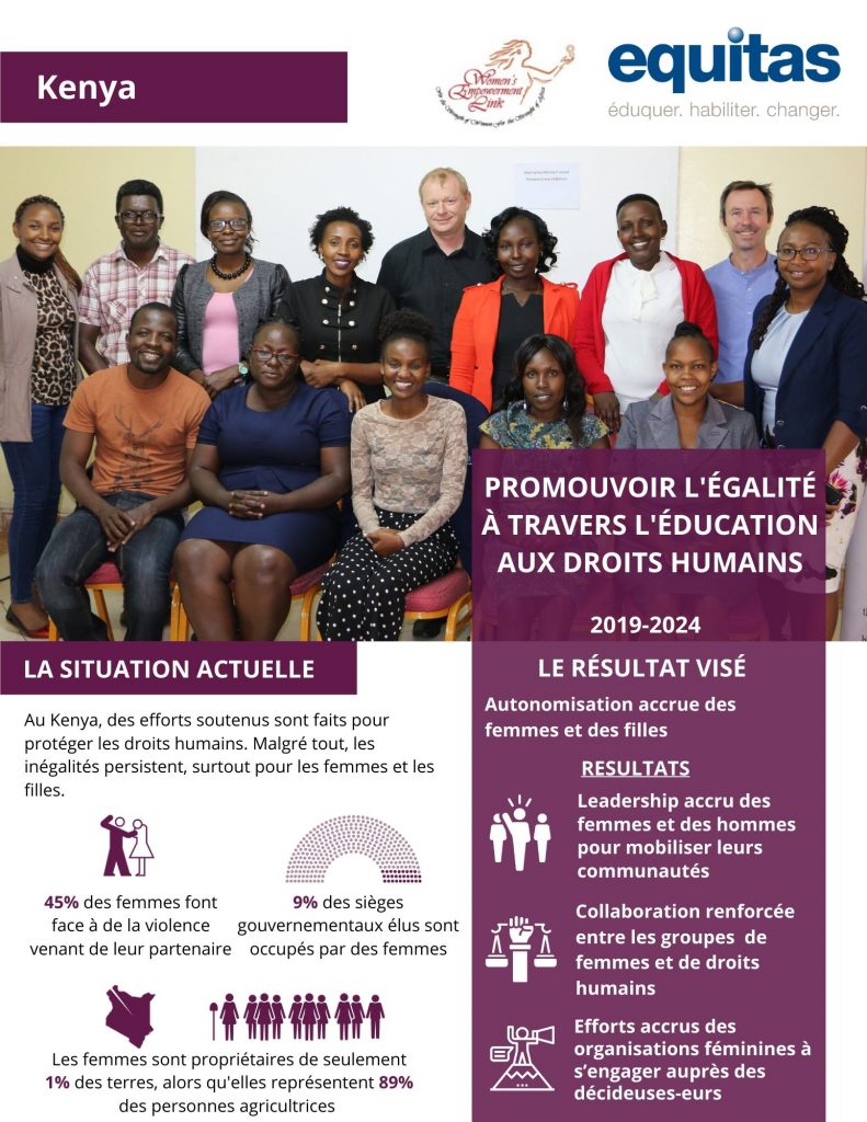 Equitas travaille au Kenya avec l’organisation Women’s Empowerment Link (WEL). Créé en 2007, WELest une organisation à but non lucratif dédiée à la défense des droits des femmes. WEL investit dans l’autonomisation des femmes et des filles afin de leur permettre de réaliser pleinement leur potentiel, leur valeur et leur force sur le plan politique, social et économique et en défendant leurs droits humains et leur droit à la justice sociale.