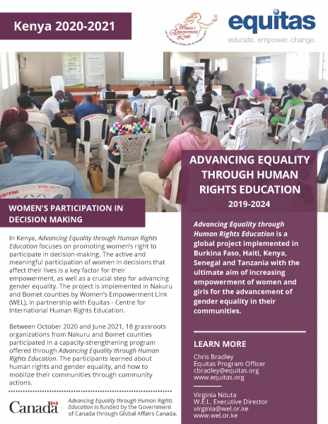 La planification et la mise en œuvre du programme Promouvoir l’égalité à travers l’éducation aux droits humains est faite en concertation avec les communautés ciblées au Kenya. Ainsi, les membres des communautés ont été consultés et ont exposé eux-même les enjeux liés à l’égalité de genre les plus urgents au sein de leurs communautés, via une collecte de données menée par Equitas et Women’s Empowerment Link lors de l’analyse de base. Les données collectées ont été par la suite restituées aux communautés et validées par elles, comme réflétant réellement les enjeux qu’ils ont exposés. À travers l’éducation aux droits humains, Equitas et Women’s Empowerment Link fourniront les outils et aptitudes nécéssaires pour réaliser le changement désiré.