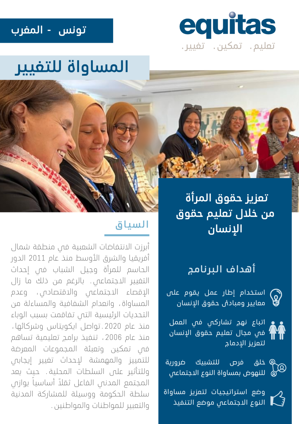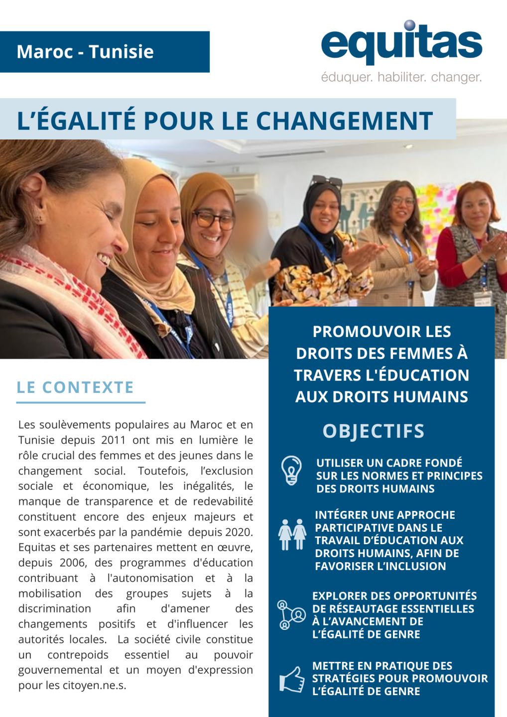 1. L’Égalité pour le changement (2021-2024) : Un programme pour la promotion des droits des femmes mené par Equitas et ses partenaires en Tunisie et au Maroc: Centre Tunisien Méditerranéen (TUMED), l’Association Voix du Sourd de Tunisie (A.V.S.T), L’Association Marocaine des Droits Humains (AMDH), et 6 autres organisations locales en Tunisie.
