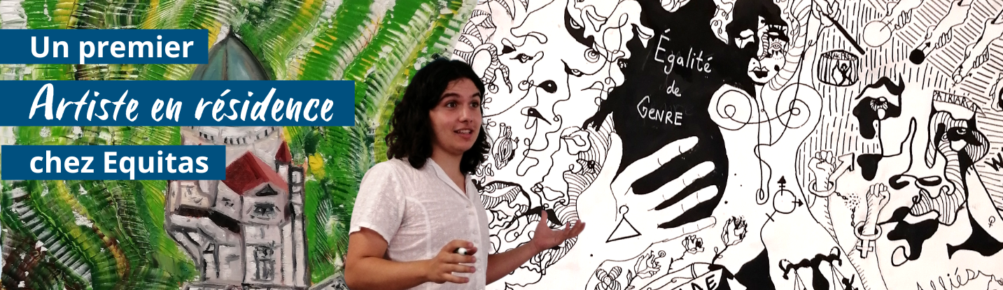 Au cours de l’été 2022, Equitas a accueilli son premier artiste en résidence, Jean Manuel Doran Penafiel, un jeune et enthousiaste artiste de Montréal. Il a suivi un cours d’art au Cégep de Rosemont, a étudié en environnement et étudie présentement en sciences humaines au cégep de Maisonneuve.