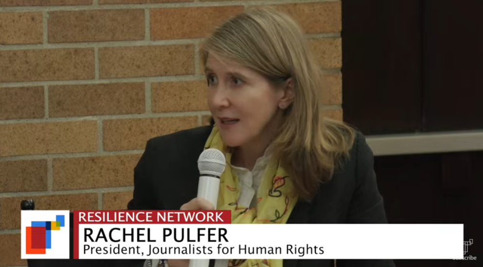 The panel discussion that followed the presentation of the Resilience Network consisted of Rachel Pulfer, president of Journalists for Human Rights as a moderator and 4 panelists: