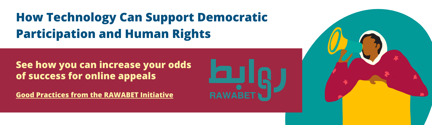 * Rawabet Initiative – Technological Bridges for Citizen Engagement implemented in partnership with : CVT – New Tactics, Centre, Tunisien Méditerranéen – TuMed (Tunisia), Ruwwad (Jordan), Association marocaine pour l’éducation de la Jeunesse – AMEJ Fes (Morocco), Horus Foundation for Development and Training (Egypt) with the financial support of the Government of Canada provided through Global Affairs Canada.