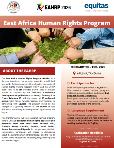 The East Africa Human Rights Program (EAHRP) is a human rights education initiative of alumni of Equitas’ annual International Human Rights Training Program from the East African region and alumni of the East Africa Human Rights program in partnership with Equitas – International Centre for Human Rights Education based in Montreal, Canada. The EAHRP arose out of the realization of the need to expand opportunities for more human rights workers operating at national and community levels seeking to acquire the knowledge and skills they need to carry out their work more effectively but who were not able to secure opportunities to attend the annual International Human Rights Training Program (IHRTP) organized by Equitas in Canada.